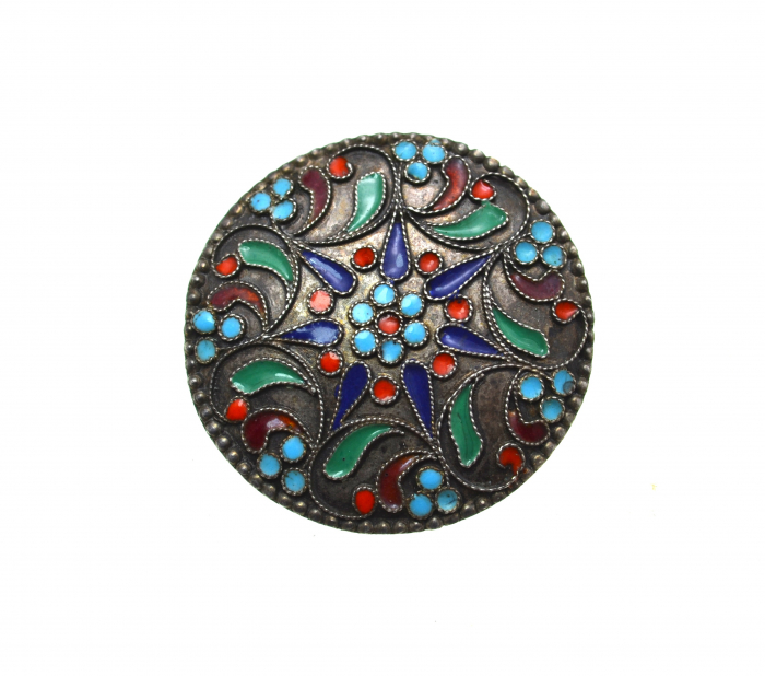 Brosa din argint vintage, splendid decorata prin emailare cloisonne in culori vibrante si detalii minutios elaborate prin filigranare manuala, atelier rusesc