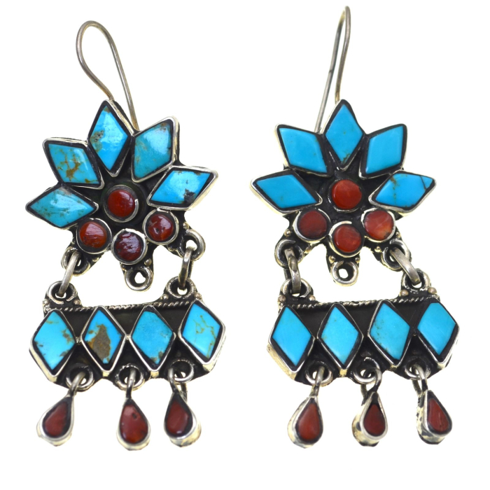 O pereche de cercei vintage din argint 925, realizati in a doua jumatate a secolului XX, cu un design etnic inspirat din estetica Native American sau tribala. Compozitia imbina forme geometrice complexe cu pietre naturale de turcoaz si carneol, intr-un contrast cromatic vibrant si echilibrat.