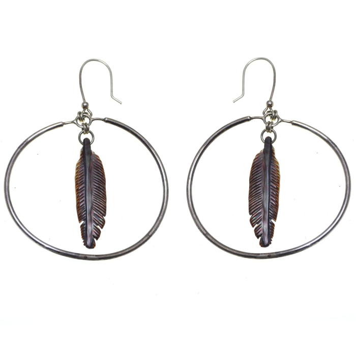 Acesti cercei vintage de tip Creole impresioneaza prin penele de vultur sculptate in sidef, un simbol puternic in cultura Navajo, asociat cu forta, onoarea si legatura spirituala. Dimensiunile generoase si executia artizanala transforma piesa intr-un accent etnic cu impact vizual.