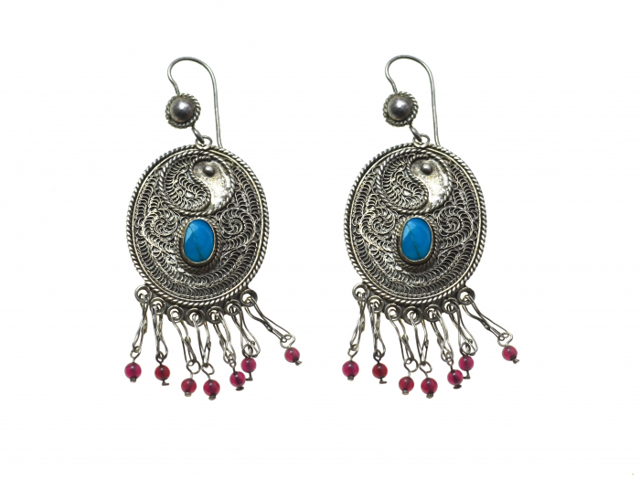 Cercei din argint vintage, etnici, decorati cu turcoaze si granate, lucrati manual cu o dantelarie de filigran de catre artizani locali orientali
