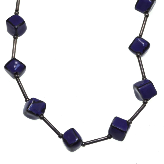 Un colier modernist cu un joc geometric elegant, imbogatit cu bile ceramice glazurate in nuante Purple intense. Argintul si ceramica creeaza un contrast contemporan si usor artistic.