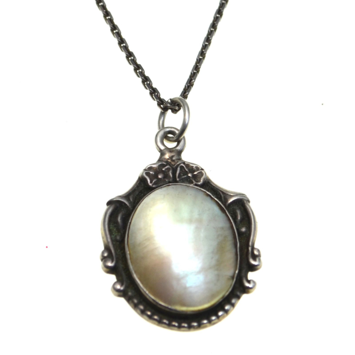 Lantul din argint cu pandant Art Deco, decorat cu sidef, este perfect pentru cele care apreciaza detaliile fine si farmecul nostalgic.