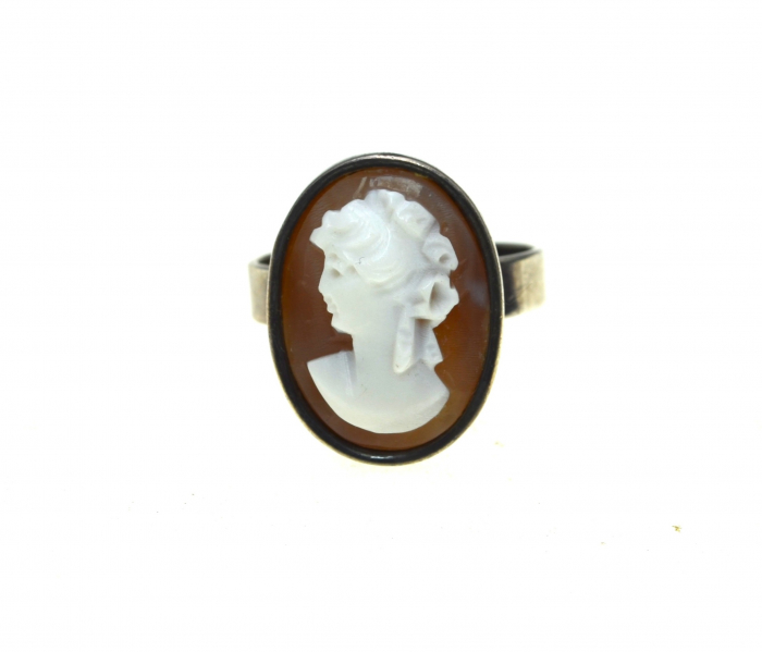Inel argint vechi, decorat camee autentica, ilustrand o efigie de dama victoriana, cu profil orientat spre partea stanga, detalii fine, exprimate in altorelief prin sculptare in scoica naturala