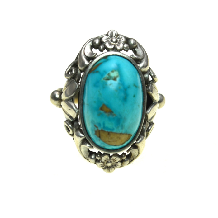 Inelul din argint vechi, interbelic, decorat cu turcoaz natural, emana un aer de noblete si istorie, perfecta pentru momente memorabile.