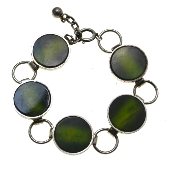 O bratara vintage din argint 830, realizata la jumatatea secolului XX, reprezentativa pentru designul modernist scandinav, unde forma clara si echilibrul vizual sunt esentiale. Compozitia geometrica pune in valoare insertiile de jad nefrit, integrate armonios in structura bratarii.