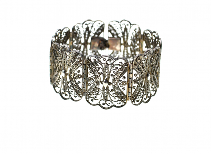 Bratara argint veche, lucrata manual in filigran Jugendstil cu bogate si complicate elemente decorative de inspiratie baroca, poanson de atelier austriac