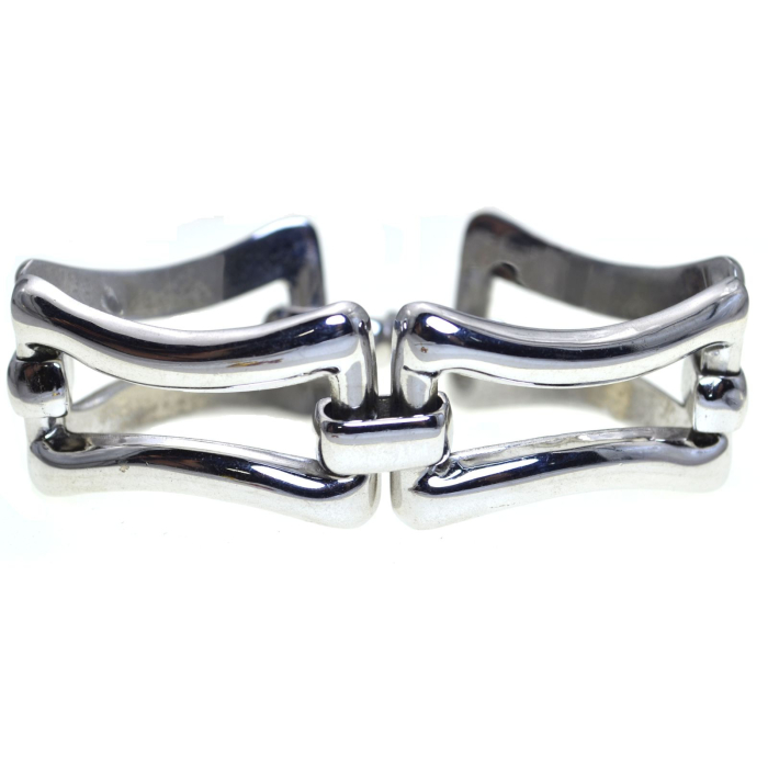 O bratara vintage din argint masiv 925, finisata prin rodiere pentru un plus de stralucire si protectie, realizata in a doua jumatate a secolului XX intr-un atelier italian. Designul piesei este definit de forme geometrice sculpturale, inspirate de estetica moderna asociata bijuteriilor de tip Tiffany.