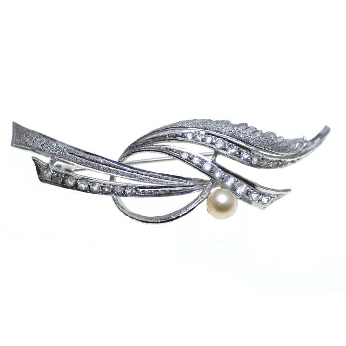Brosa din argint rodiat vintage, cu perla si cristale CZ, ofera un echilibru perfect intre stilul vintage si eleganta moderna, fiind accesoriul ideal pentru orice eveniment.