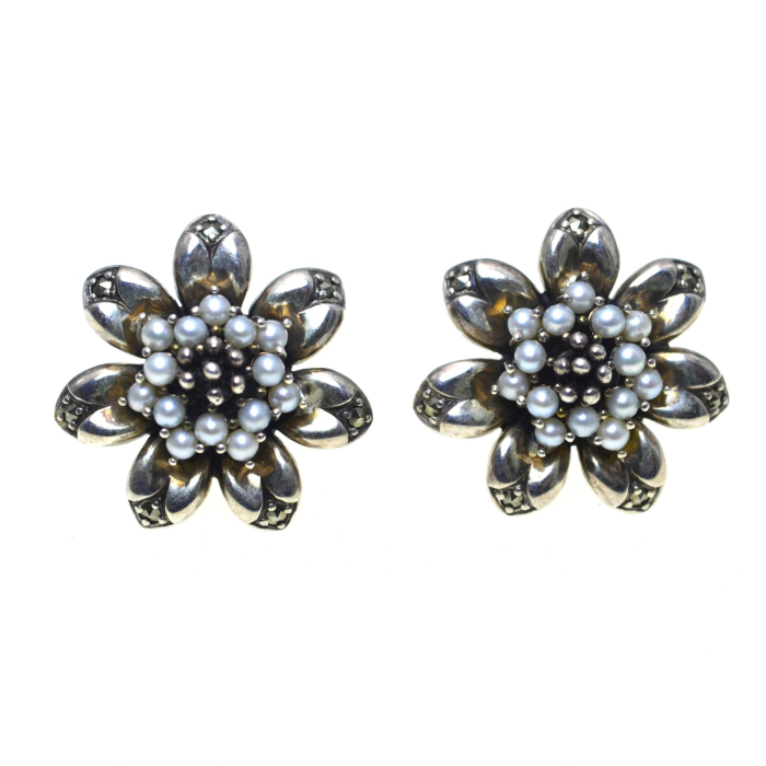 Cerceii din argint vintage, model Crizanteme, decorati cu perle naturale, emana un aer de noblete si istorie, perfecta pentru momente memorabile.